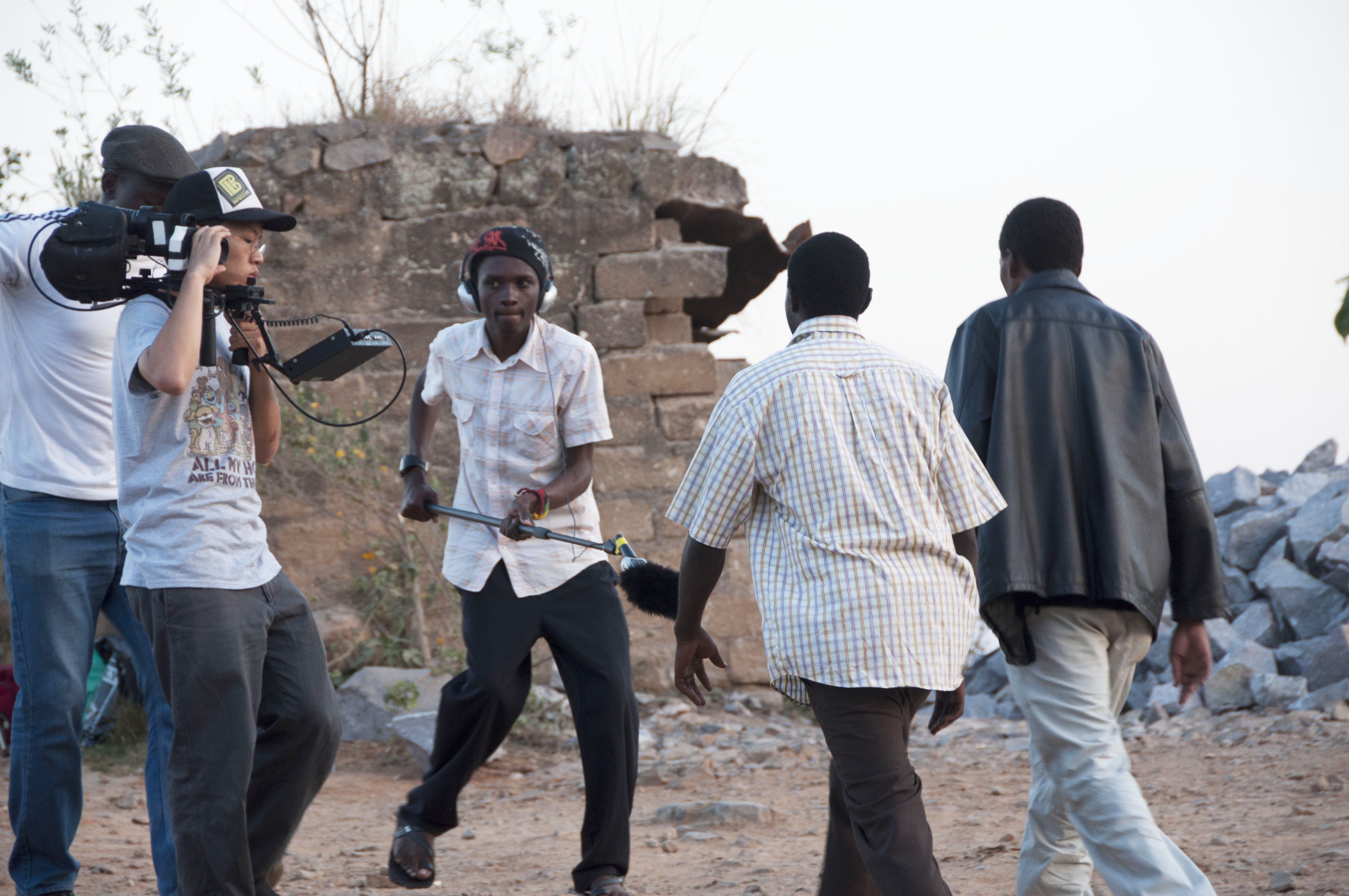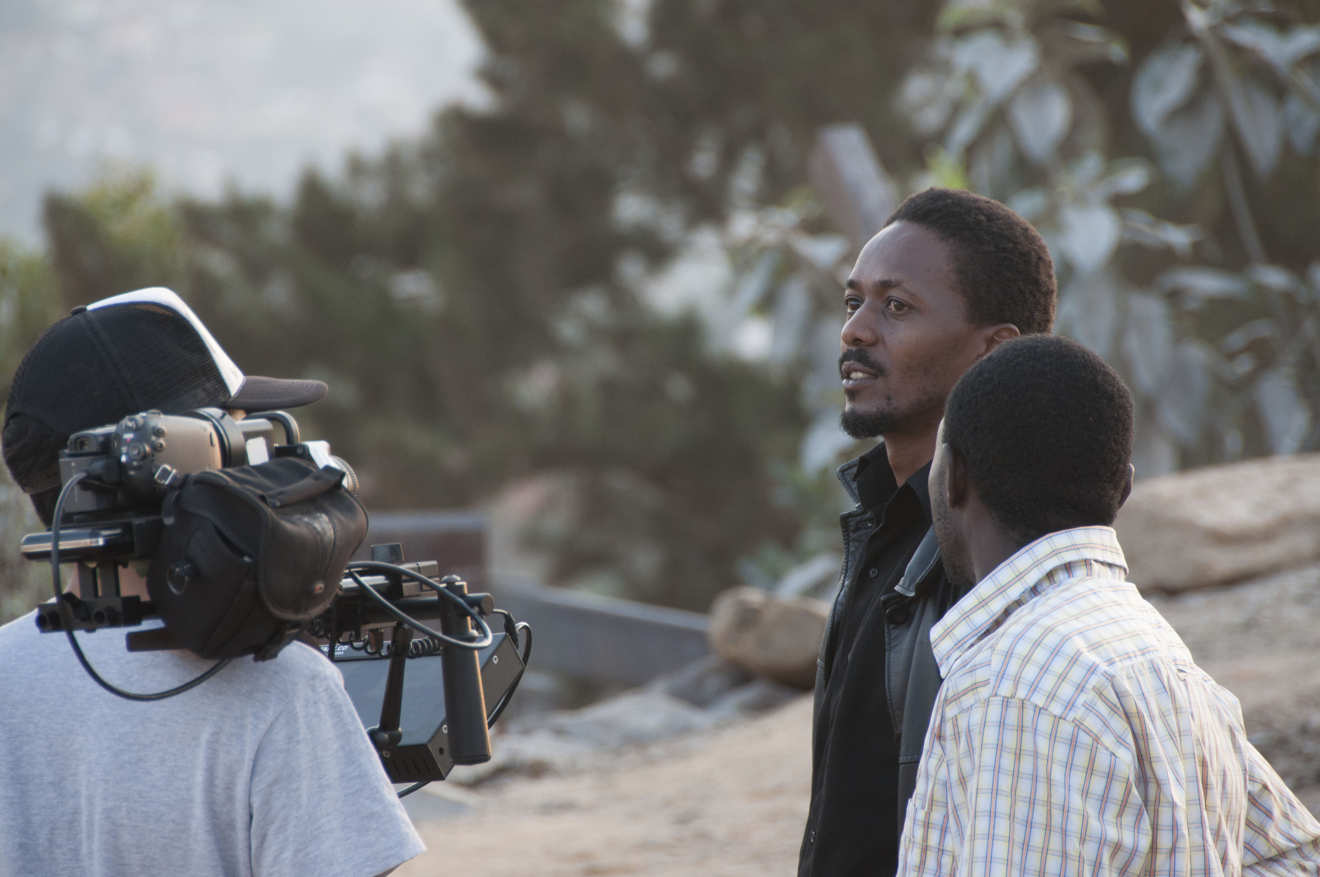 Director Young G. Kim, lead actor James Bagyenzi and supporting actor Felix Bwanika get ready for a take.